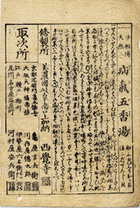 疝氣五香湯はこの“疝氣”の名称がついた美濃國(岐阜県)の西覺寺で作られていた伝統薬で、江戸時代から作られておりました。(江戸期のチラシ参考。江戸では瀬戸物町の伊勢屋六右衛門が取次、販売していた。)